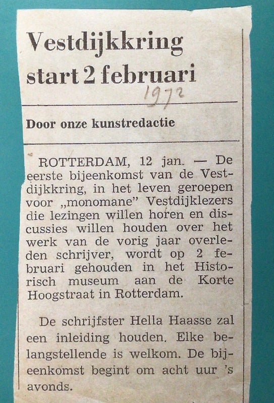 Het liep niet direct storm, maar samen met Rob Rijnbeek, een student-assistent, plaatste Ria na de zomervakantie 1971 een nieuwe oproep in Sint Jobstijdingen, het intern bulletin van de Faculteit. Het was gericht aan ‘alle Vestdijk-lezers en niet-Vestdijk-lezers.’ Het einddoel was naar boven bijgesteld: het ging nu om de oprichting van een ‘Vestdijk-fanclub’, al werd nog gebroed op ‘een volwassener benaming’. Dit leverde meer aanmeldingen op en daarna ging het crescendo. De aspiraties stegen spoedig boven de beslotenheid van de Faculteit uit. Dit bleek uit een brief van 25 november van ‘tijdelijk voorzitter’ Albeda aan Alfred Kossmann, werkzaam op de Rotterdamse redactie van Het vrije volk. Gekozen was voor de naam Vestdijkkring, een genootschap ‘in oprichting’ dat men wilde uitbreiden tot een landelijke vereniging. In het Hogeschoolblad Quod Novum van december stond evenwel nog de bevestiging van een door Ria ondertekend bericht ‘Vestdijkfanclub opgericht’, maar wel met vermelding van het ‘streven naar een landelijke organisatie’. Op 12 januari verscheen in kranten het bericht van de oprichting van de Vestdijkkring op 2 februari. Als bron voor dit bericht kan het in druk verschenen programmaboekje van de Hogeschoolse Studium Generale zijn gebruikt. De mede-organisator van de bijeenkomst maakte melding van Hella Haasse als inleider.