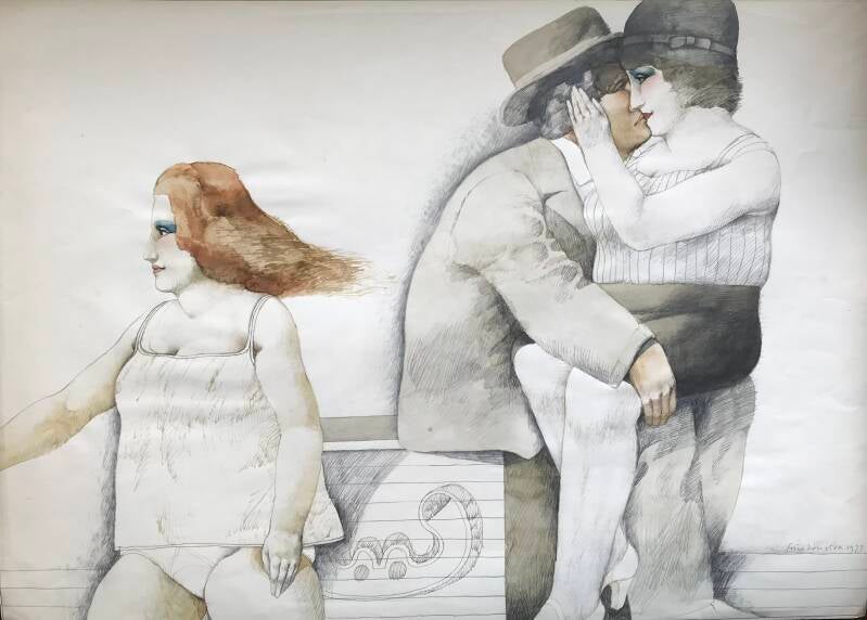 Zo past een opmerking van Langeveld over Dostojevski op Vestdijk. Langeveld waarschuwt: ‘Dostojevski is opera en wie daar niet van houdt kan maar beter uit de buurt blijven.’[70] Ik liet deze groteske los op Vestdijks De koperen tuin, volgens hem zijn beste roman, die niet alleen de uitvoering van de opera Carmen bevat, maar zelf blijkt opgezet als is het een opera, scenisch geschreven, met uitersten van dramatische passie. Voor De kellner, míjn favoriete roman, geldt eigenlijk hetzelfde met Christus in de rol van kelner die een weddenschap met God aangaat over de eventuele veroordeling van God als falende schepper. Nadat de flatbewoners zijn ingelicht over de geregisseerde droom, zendt deze ‘goede’ kelner hen heen met woorden die de grondslag van het existentialisme parafraseren: U bent veroordeeld en begenadigd om verder te leven.[71]